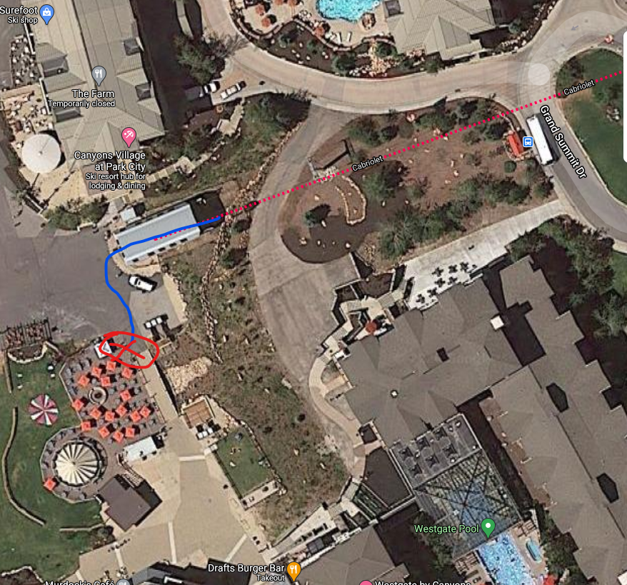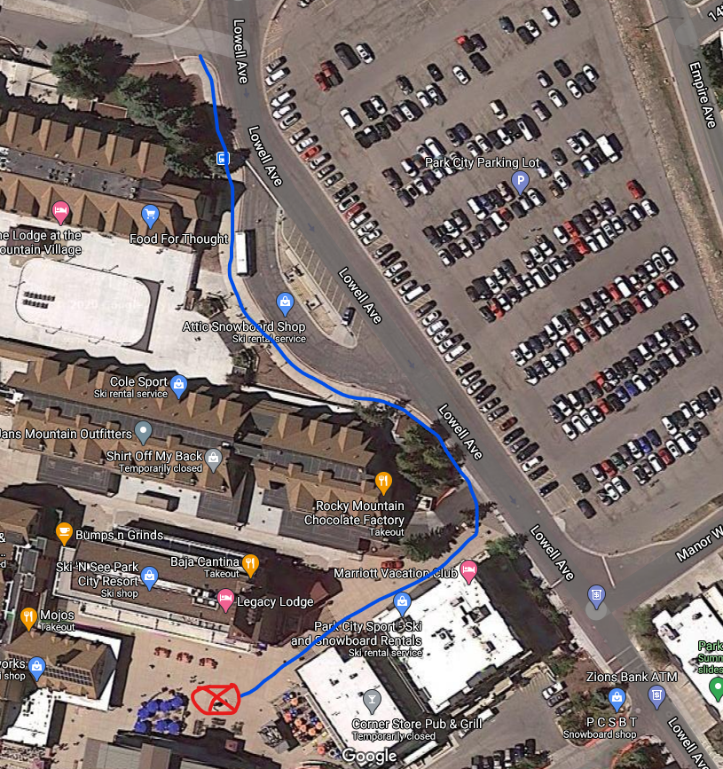 Please park at the Silver King Lot, next to the Silver King Hotel. Even better, use public transit to the Park City Mountain Base. We will meet at the eagle statue (click below to view the video on getting to the eagle statue). The Blue line below represents the walking path from the Silver King lot, to the building, Marked with a red “X”.