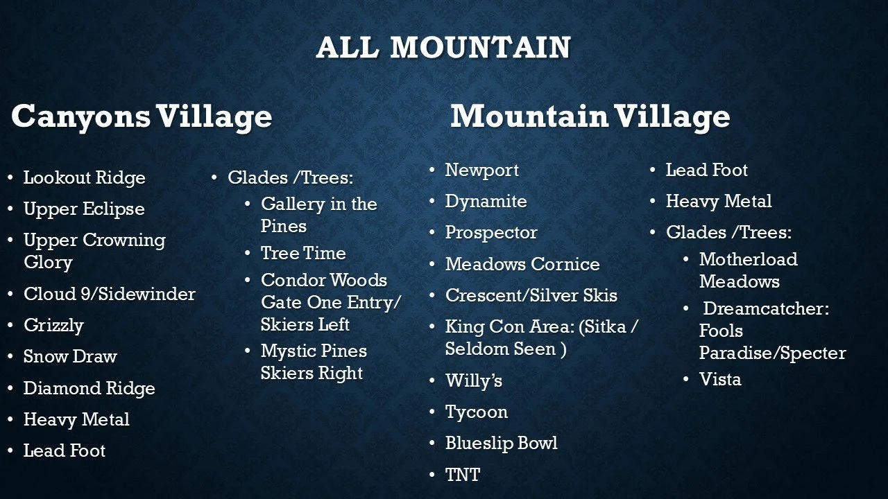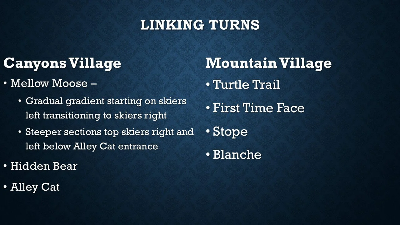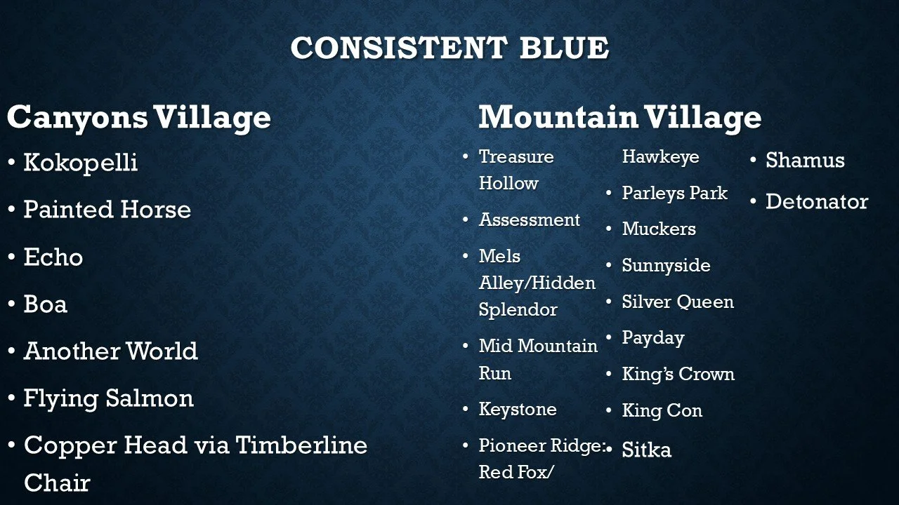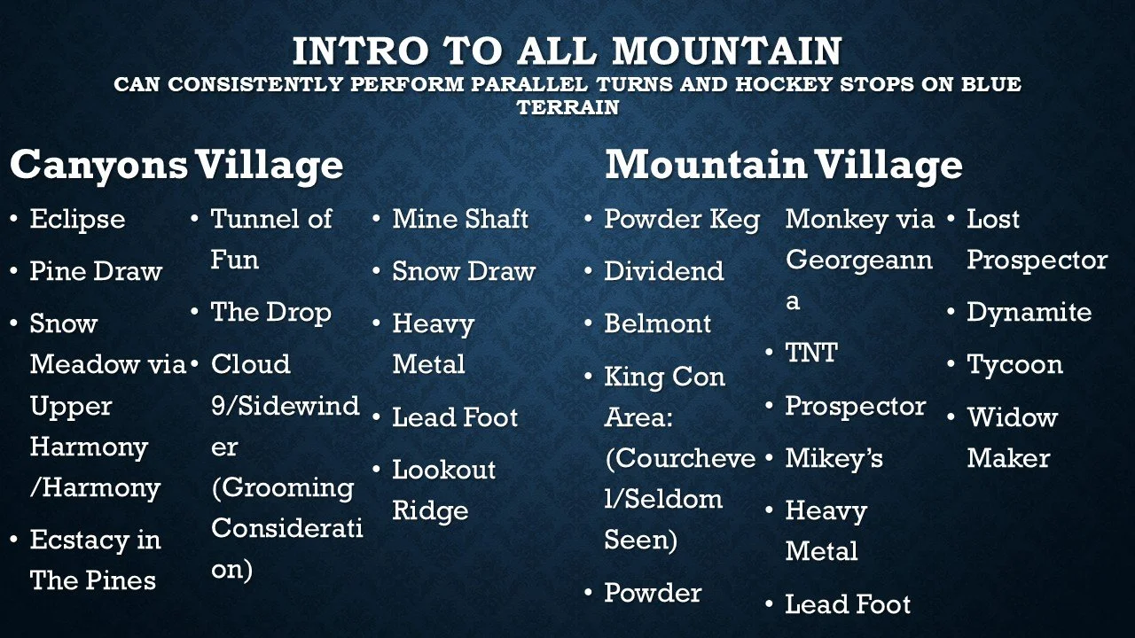 Blue and Black terrain for experienced riders, who are skiing/riding in a Consistent Blues and Intro to All Mountain Class.