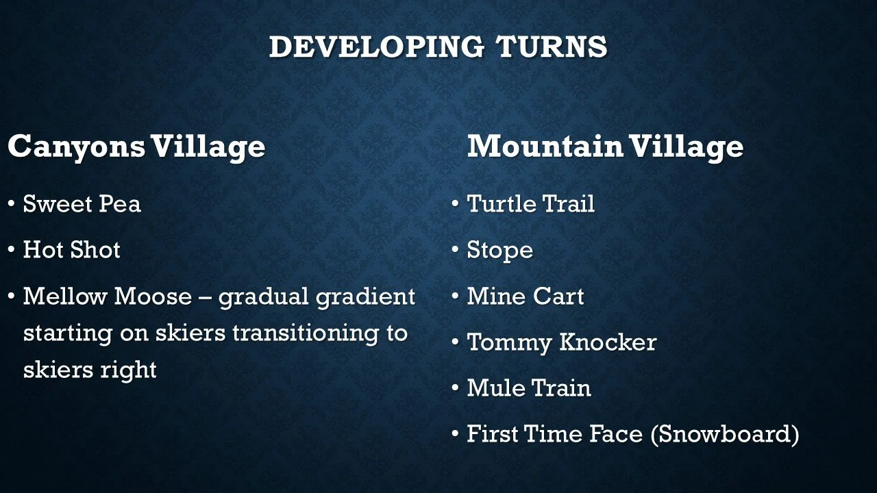 Green and Blue terrain for newer skiers and riders, who are skiing/riding in a Linking Turns, and Confident Turns Class